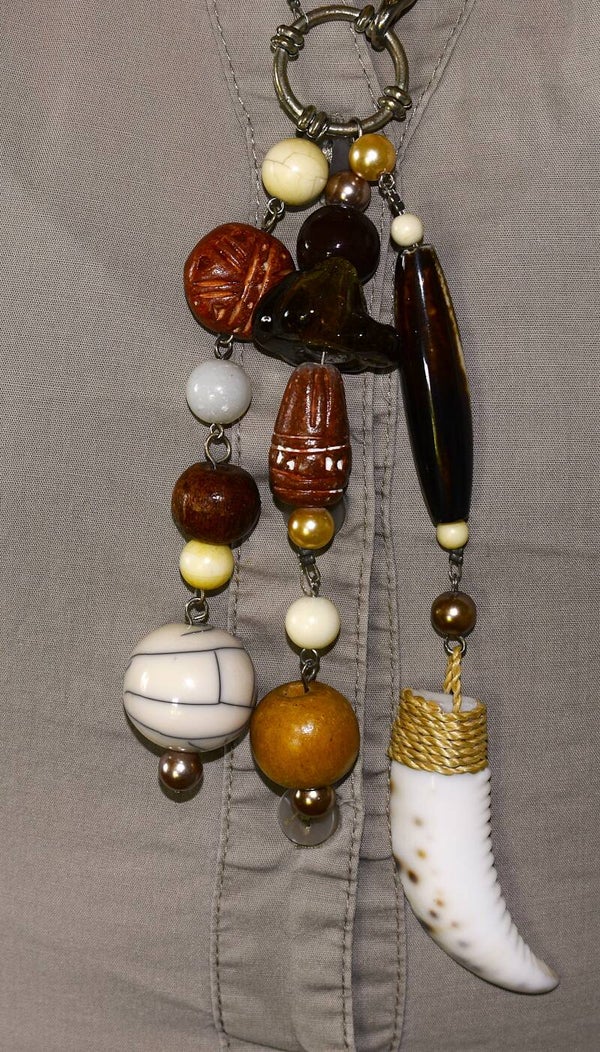 Op zoek naar een bijzondere accessoire? Deze prachtige ketting, met een mix van hout, glas en mogelijk been of ivoor, is een echte blikvanger. De diverse kralen en bedels zorgen voor een unieke en stijlvolle uitstraling.
